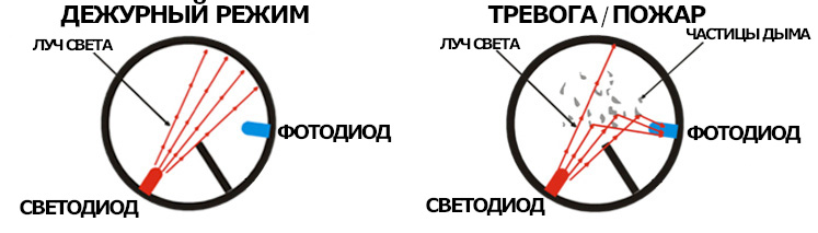 Наиболее популярные и безопасные типы ИПД — фотоэлектрические («оптические», «оптико-электронные»). В их корпусе располагается светодиод, испускающий луч света. В норме он направлен по прямой линии и не попадает на детектор-фотодиод. При пожаре частицы дыма попадают во внутреннюю камеру извещателя, преломляют свет и извещатель срабатывает: