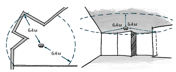 Сколько дымовых извещателей должно быть в помещении — зависит от его параметров (высоты, формы) и радиуса действия датчиков. Количество рассчитывается индивидуально. Каждая точка помещения должна быть покрыта «зоной контроля».